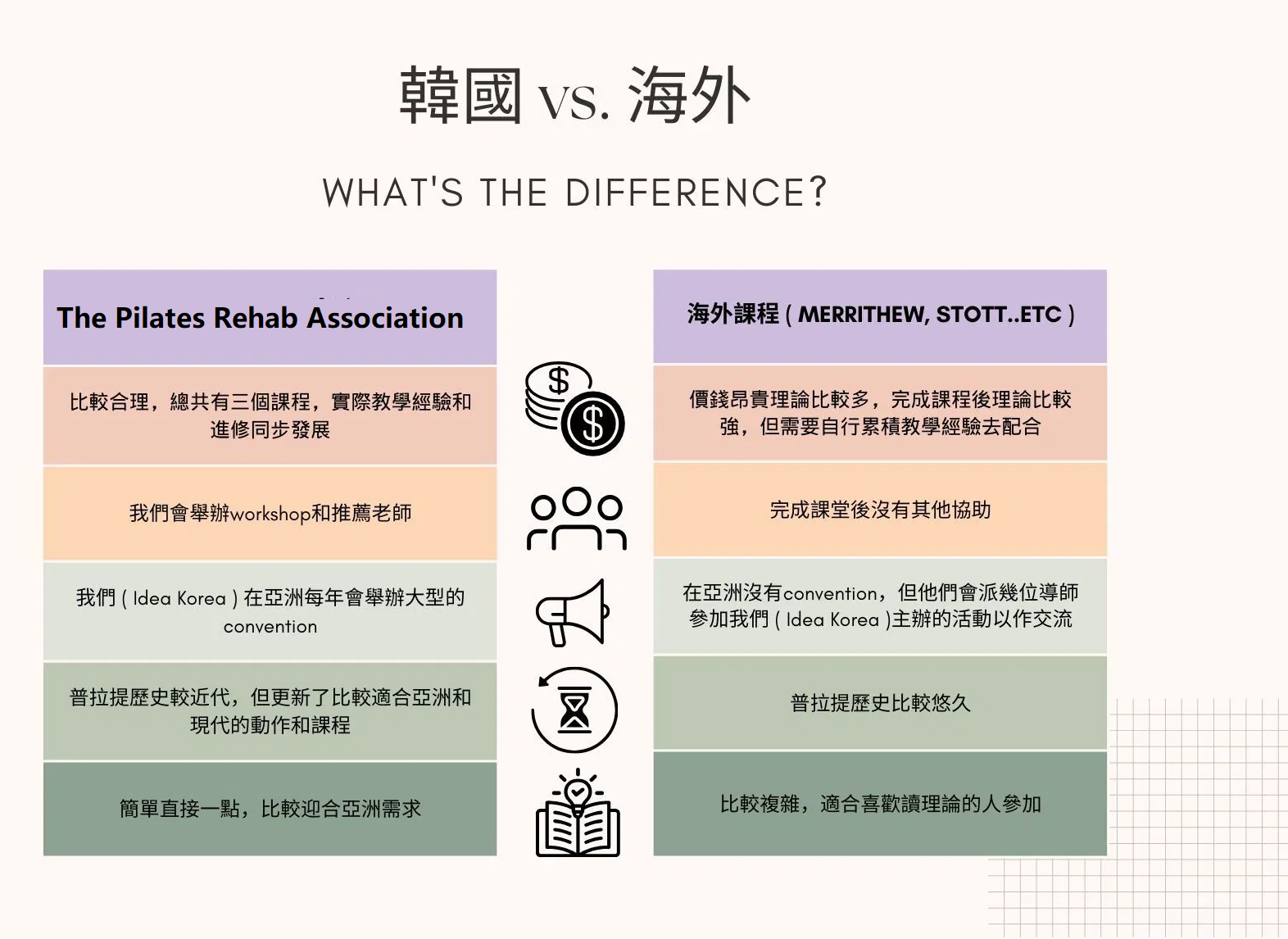 答:我們是全港唯一韓國京畿道協會合作夥伴The Pilates Rehab Association 分院, 遇到韓國進修或找工作可得到我們韓國團隊的支援.